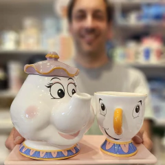 Set Bella y Bestia, un conjunto encantador que incluye taza, tetera y bandeja con el diseño icónico de la señora Potts y Chip. Cada pieza está fabricada totalmente a mano en cerámica de alta calidad, brindando un toque artesanal y único a tu mesa.